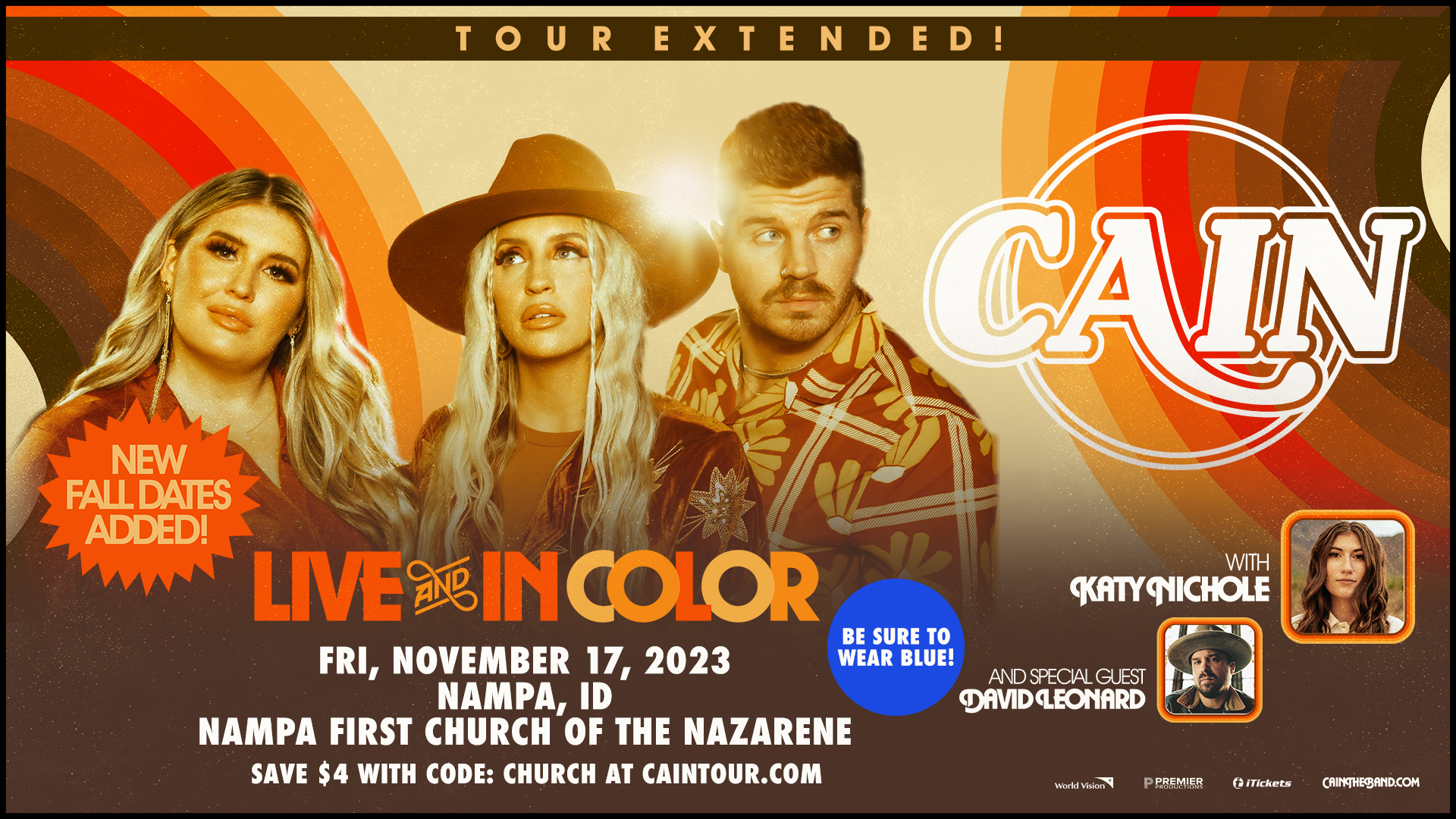 BIG NEWS! Cain Live and in Color Tour is coming to our church on November 17th with special guests Katy Nichole and David Leonard! Church Members can get tickets first and save 4$ with code: CHURCH. On sale now at www.CainTour.com!
