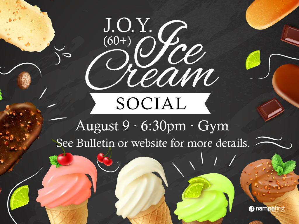 The J.O.Y. Ice Cream Social will be held on August 9th at 6:30 pm, don’t miss this time of fun and fellowship as we enjoy a sweet treat together!