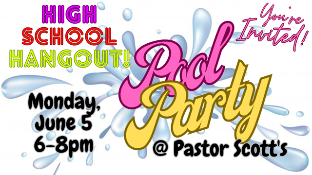 Pastor Scott's House 222 S Powerline RdIt’s a Pool Party, so bring your swim suit (think modesty), a towel, and a desire to laugh! We may find ourselves having a fire in the fire pit if it isn’t too hot. Hot dogs will be grilled/roasted and we’ll have beverages available.